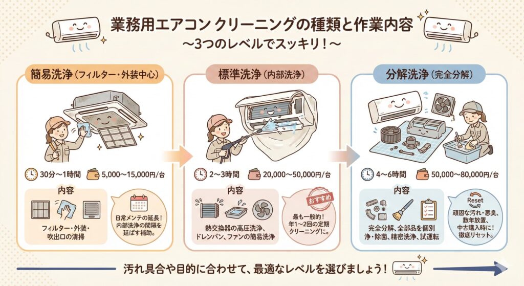 エアコンのクリーニングには大きく3つのレベルがあります。