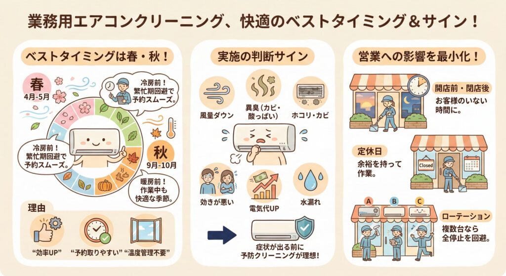 業務用エアコン清掃の時期はいつ?飲食店・オフィス別の推奨サイクルと業者選び方