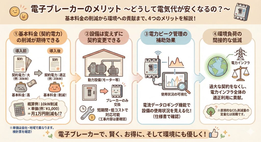 電子ブレーカーの導入により契約電力を引き下げられると、毎月の基本料金が下がります。