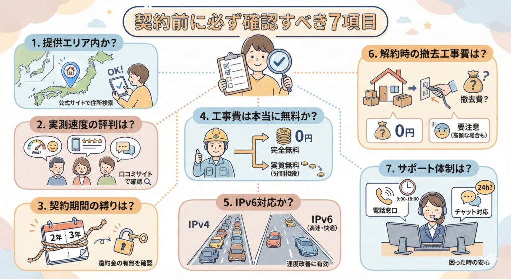- 総額コストを試算 → 月額だけでなく工事費・違約金・撤去費も含める