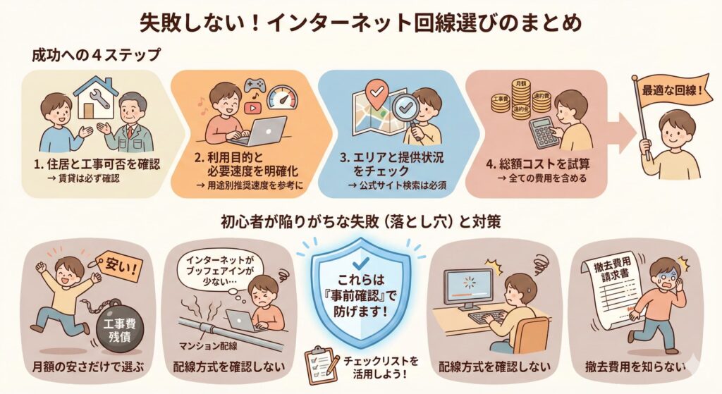 インターネット回線選びで失敗しないためには、以下の4ステップが重要です。