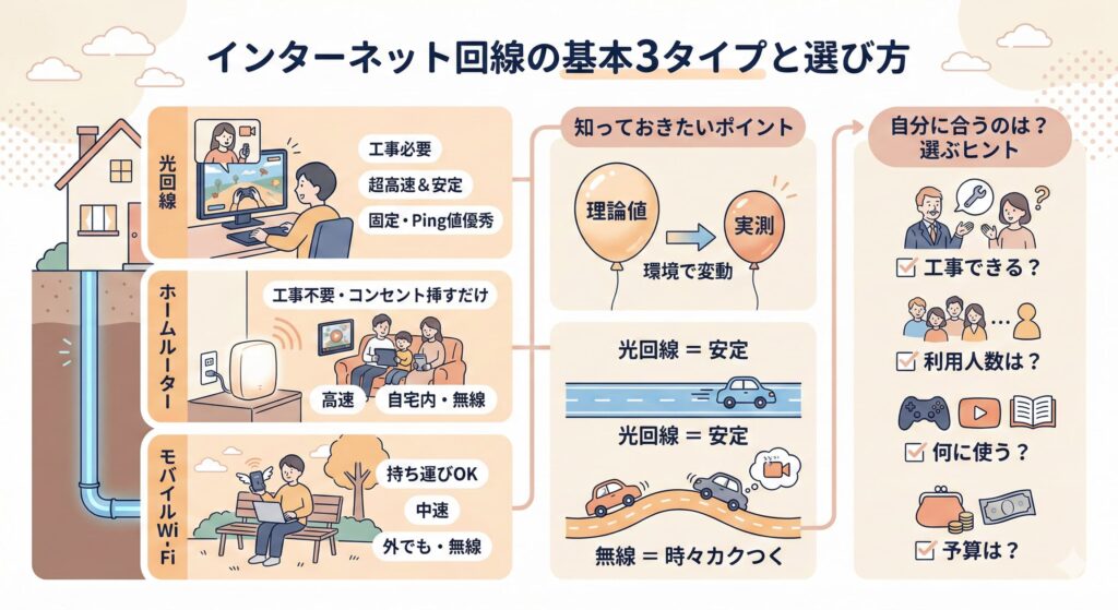 | 回線タイプ | 工事 | 速度目安 | 主な利用シーン | 移動性 |