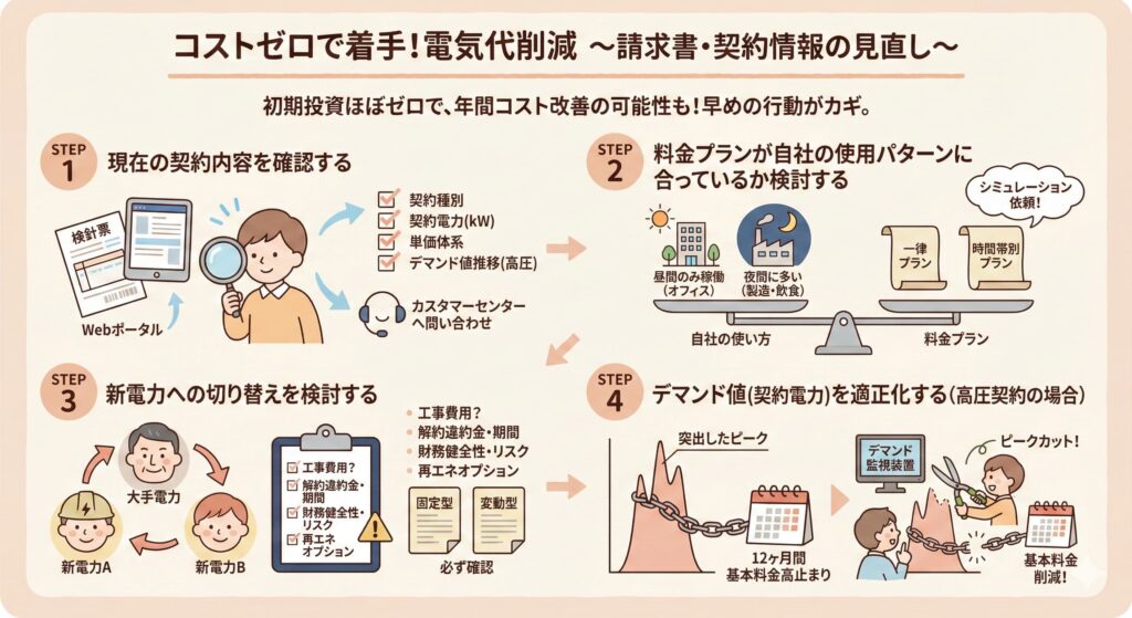 まずは電気料金明細と契約内容の確認から始め、「契約の見直し→設備の効率化→運用ルールの整備」の順で優先度をつけて取り組みましょう。