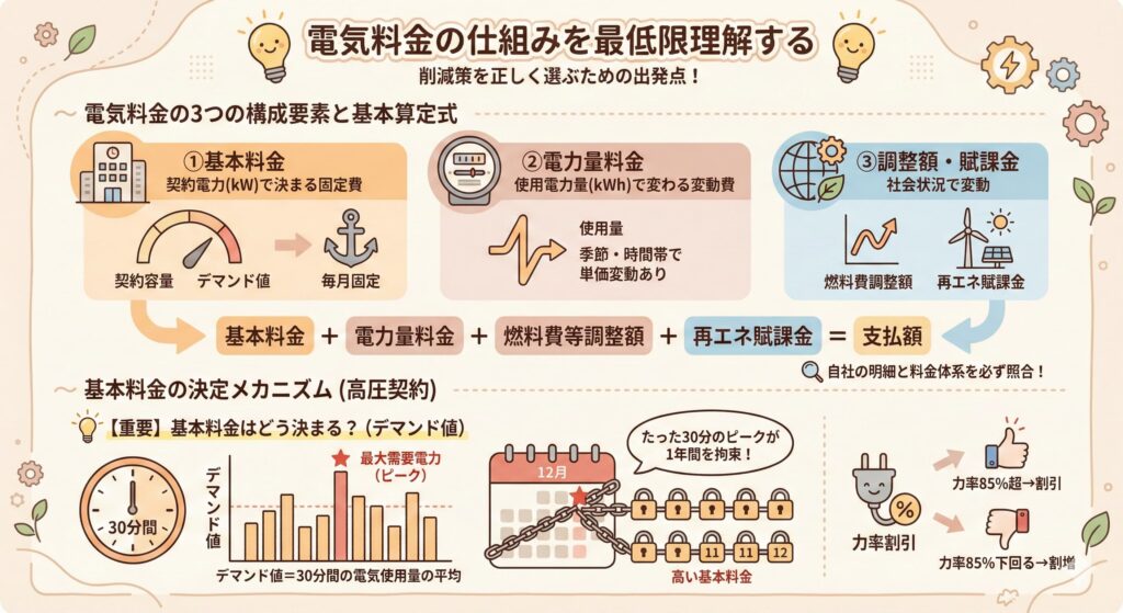 削減策を正しく選ぶためには、電気料金がどのように計算されているかを知ることが出発点です。