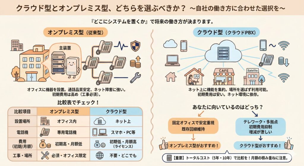 オンプレミス型が向く人: 通話品質を最優先したい、既存の電話番号(アナログ/ISDN)を絶対に変えたくない、大規模なコールセンター。