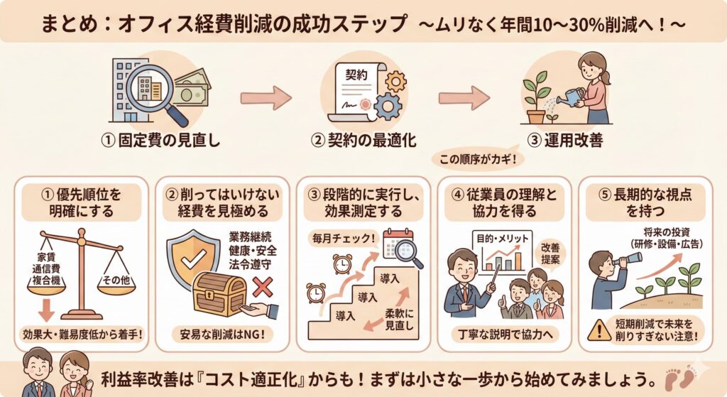 オフィスの経費削減は、「固定費の見直し」→「契約の最適化」→「運用改善」の順で進めることで、業務への影響を最小限に抑えながら、年間10〜30%のコスト削減が実現できます。