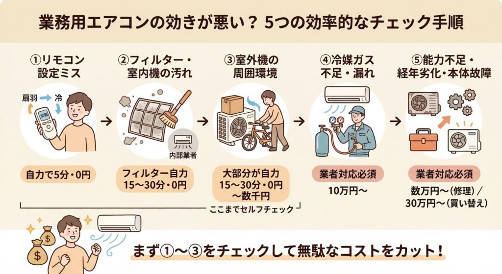 簡単な対処だけで効きが改善するケースも多いため、設定確認・フィルター清掃の次に必ずチェックしてください。