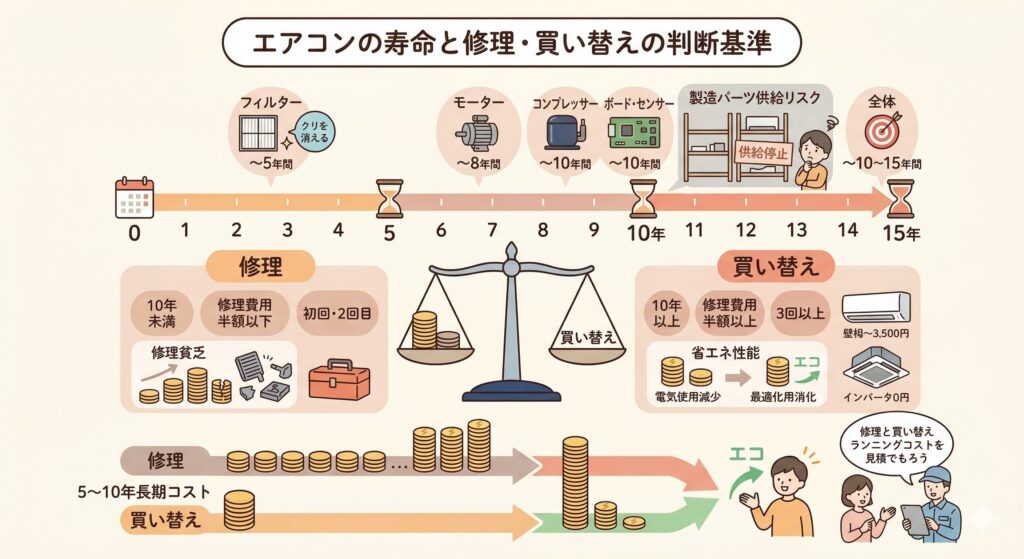 部品 寿命の目安 フィルター 約5年(定期清掃で延命可能) ファンモーター 約8年 コンプレッサー 約10年 電子基板・センサー 約10年 本体全体 10〜15年 ※上記は一般的な目安です(※確認日:2026-03-19時点)。使用頻度・環境により大きく異なります。