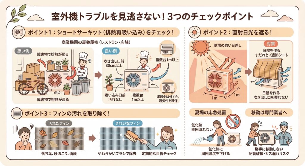 ここでは、自力でチェックできる室外機周辺の3つのポイントを解説します。