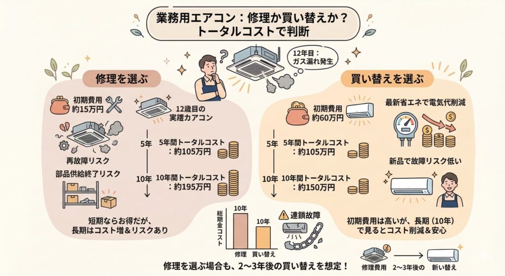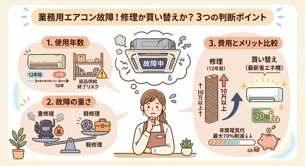 たとえば、購入から12年経った天井カセット型エアコンのコンプレッサーが故障した場合、修理費は10万円以上かかる一方、最新の省エネ機への買い替えで年間電気代を最大70%削減できる可能性があります。