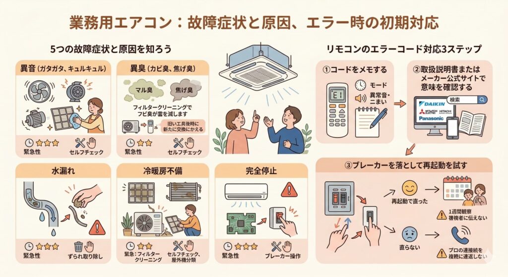 業務用エアコンの故障にはパターンがあり、症状を正しく把握すれば対処法を絞り込めます。