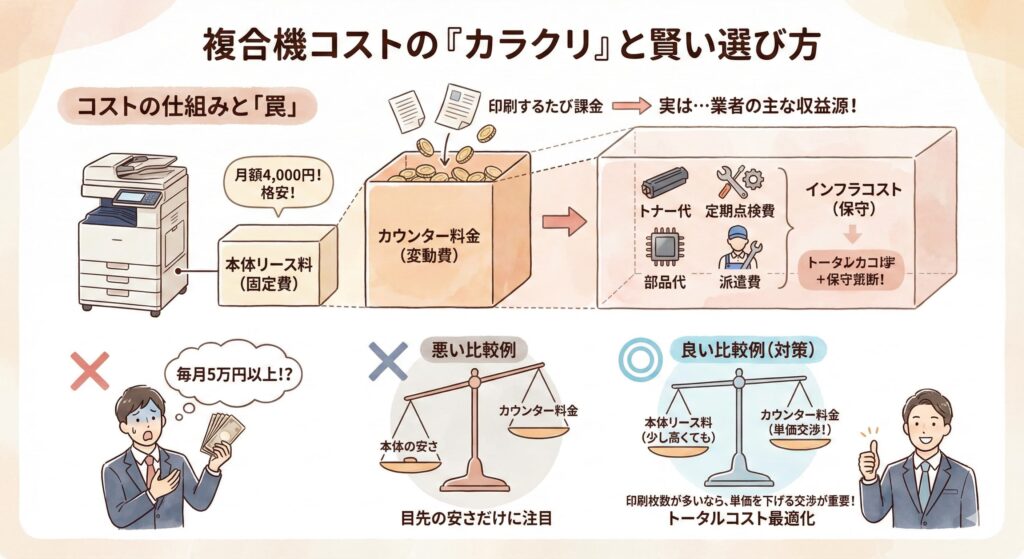 多くのユーザーは本体価格の安さに目を奪われがちですが、カウンター料金(印刷1枚ごとの課金)こそが業者の主な収益源であり、ユーザーにとってのコスト増の要因です 。