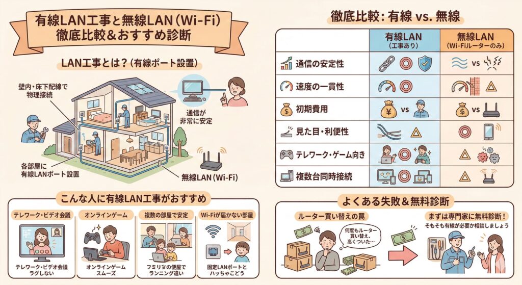 | 比較項目 | 有線LAN(工事あり) | 無線LAN(Wi-Fiルーターのみ) |