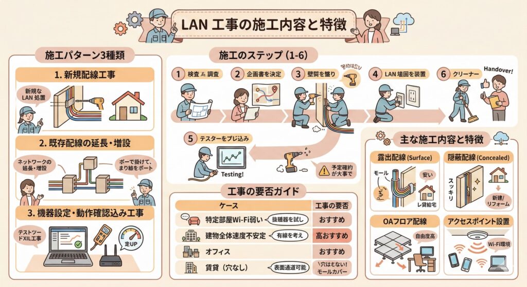 - 配線作業:LANケーブルを敷設。壁内配線の場合は壁に穴を開ける場合あり