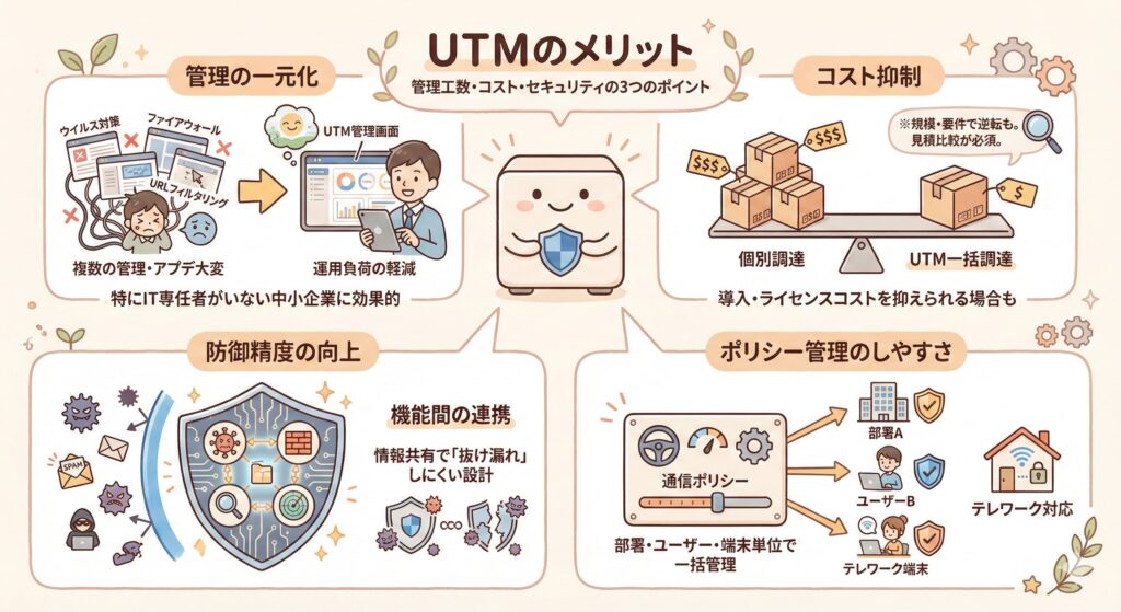 UTMを導入によってどのようなメリットがあるのかを、特に管理工数・コスト・セキュリティの3つのポイントに絞って解説します。